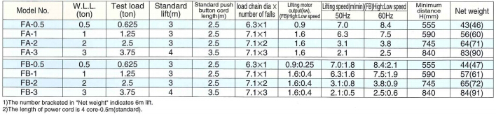 象牌FA/FB系列電動葫蘆參數圖: